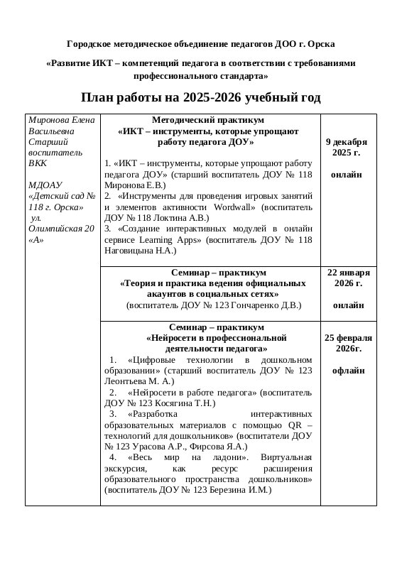 План работы городской площадки